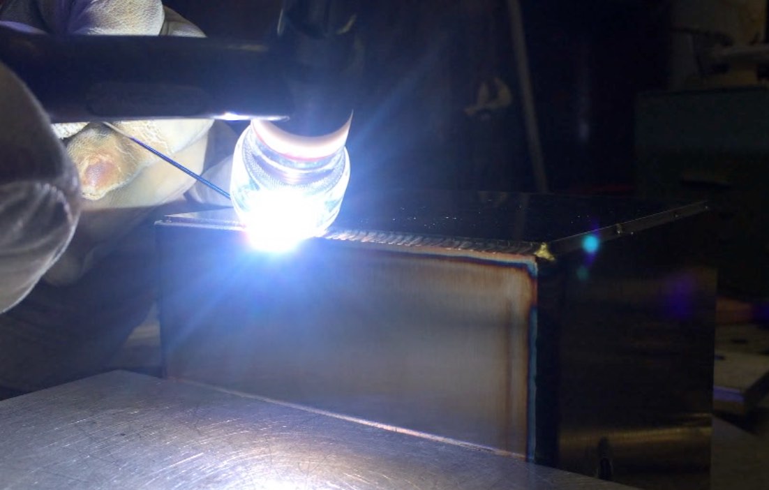 using 11 ga stainless steel, that was water jet cut... my friend Roy shows how he uses a #12 furick cup and chill bars to get great argon shielding on this small argon purge box.