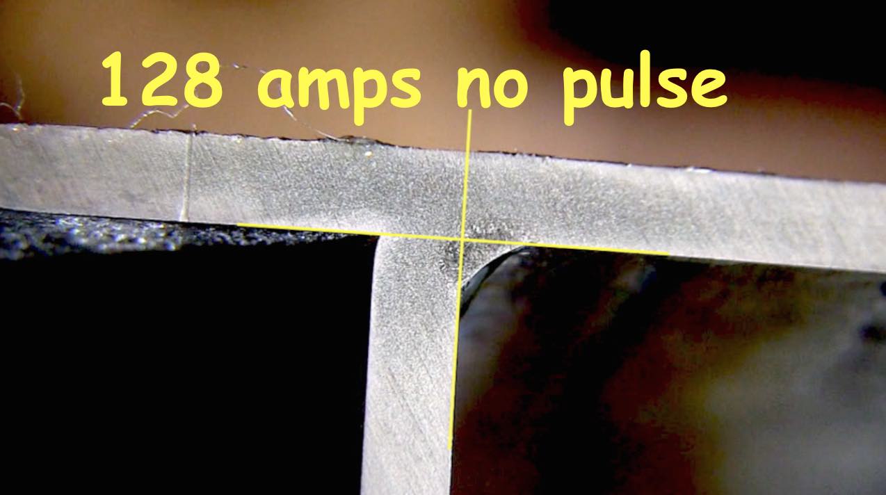 I welded one tee joint at 128 amps with no pulse. I set the main amps to 131 amps but I didnt quite use all of it and maxed out at 128.