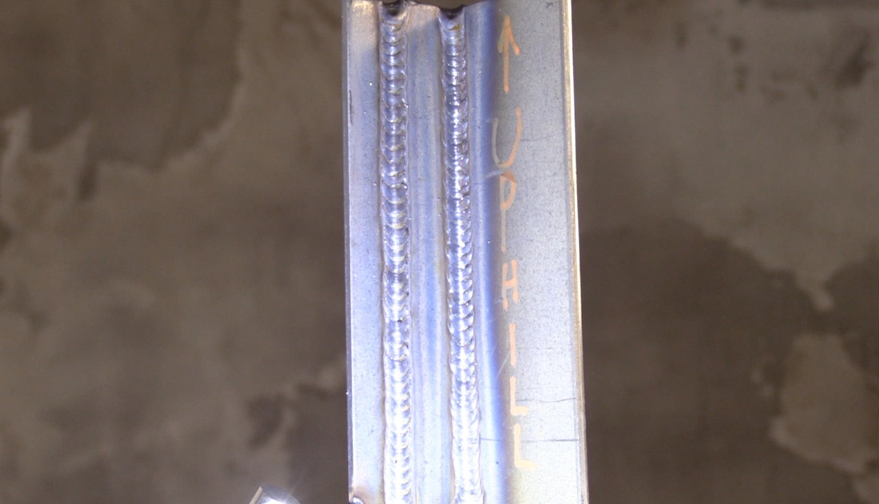 I set up a lap and tee joint on 11 ga steel and welded vertical uphill using an inductance setting of 100% using the Esab Rebel 205.