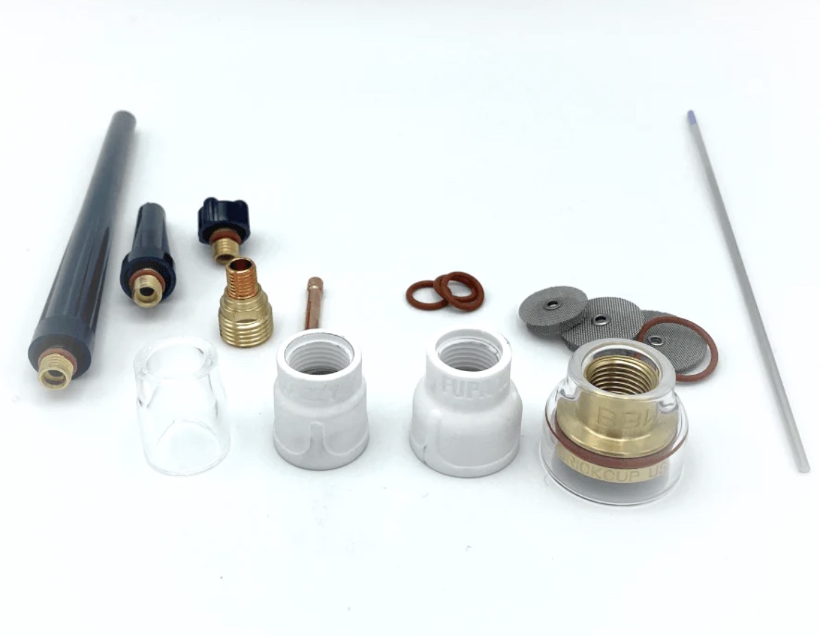 This kit comes with #4 thru #8 cups and also has a 3/32" furick gas lens with O-ring groove that lets you use clear cups and other furick gas lens cups.